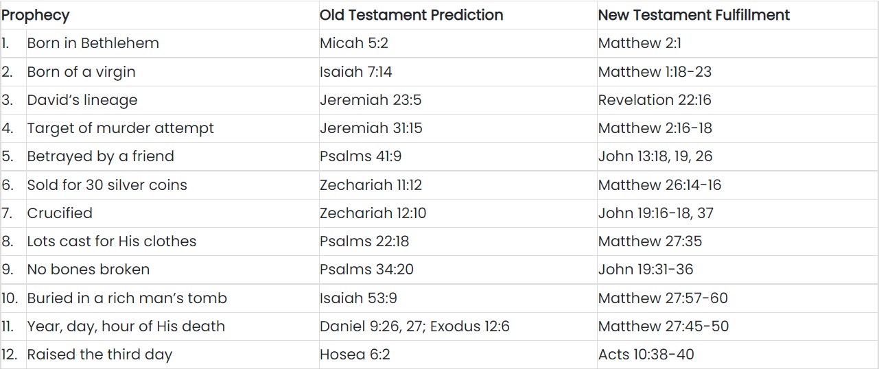 Answer: The Old Testament predictions of the Messiah were so specific and so clearly fulfilled by Jesus of Nazareth that both Jesus and Apollos used these prophecies to prove that Jesus was indeed the Messiah. There are more than 125 of these prophecies. Let’s review just 12 of them: